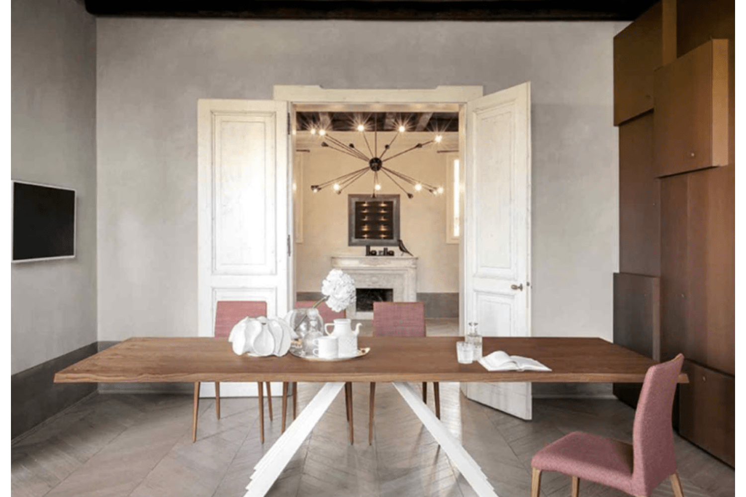 Originating in Italy and crafted from premium Italian materials, Ventaglio represents a perfect fusion of artisanal skill and excellence. Its standout feature lies in the gracefully curved metal legs, available in a variety of colors. The table comes with tops crafted from glass, tempered glass, and wood, offered in both fixed and extendable options. Delve into the refined design, particularly showcased in the extendable wooden version, where solid wood adds durability and enhances beauty. The entire ensemble, warm, resistant, elegant, and classic, stands out against the contemporary base.