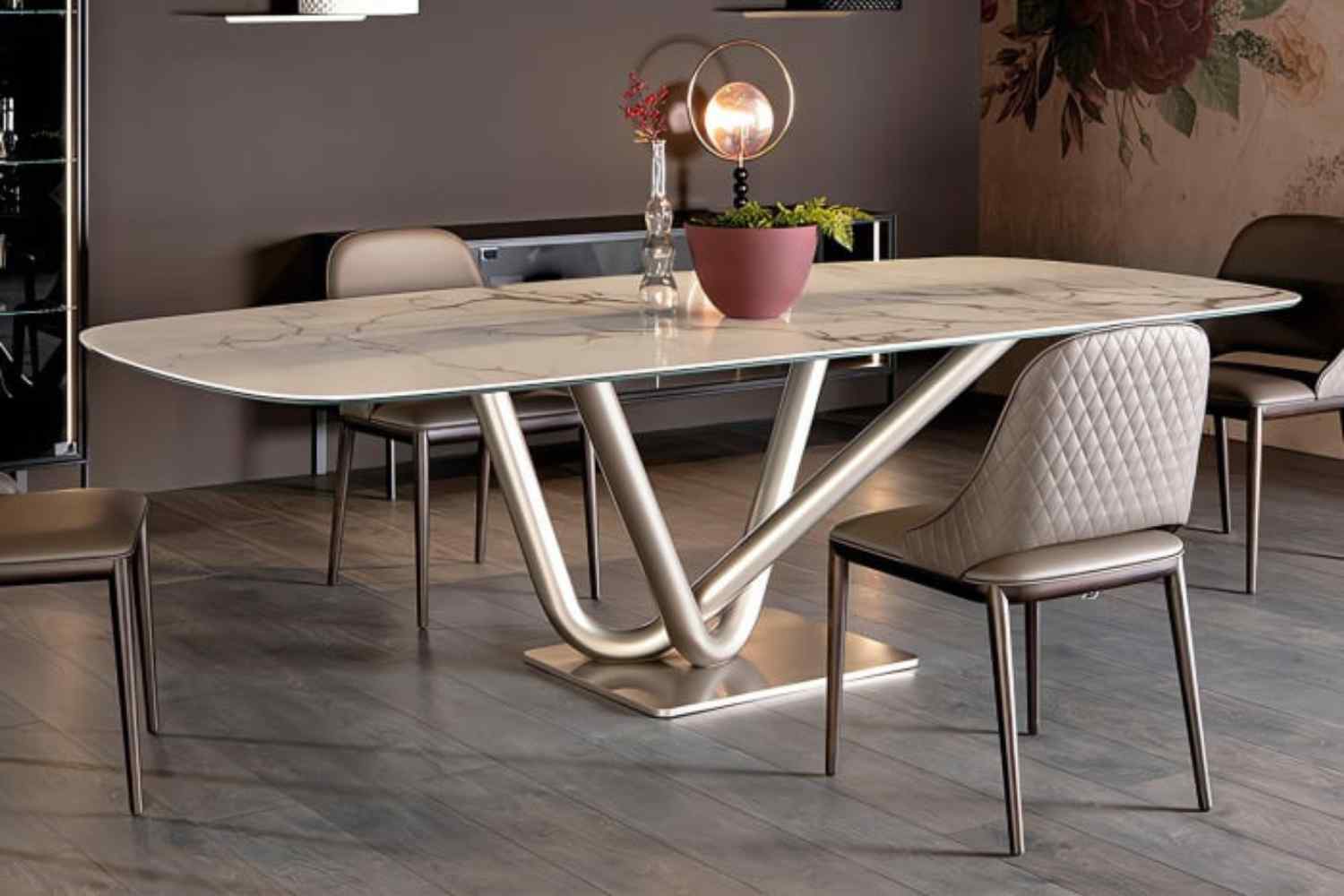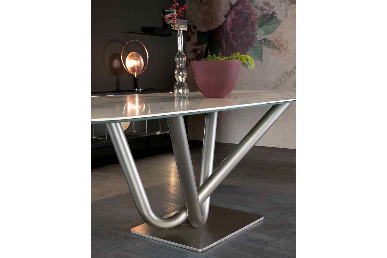 The Victory table epitomizes sleek, contemporary elegance, exuding a distinct personality through the harmonious fusion of two solid V-shaped bases in painted metal. These bases delicately support a spacious top, which can be personalized with a variety of available finishes, resulting in furniture of significant aesthetic impact.